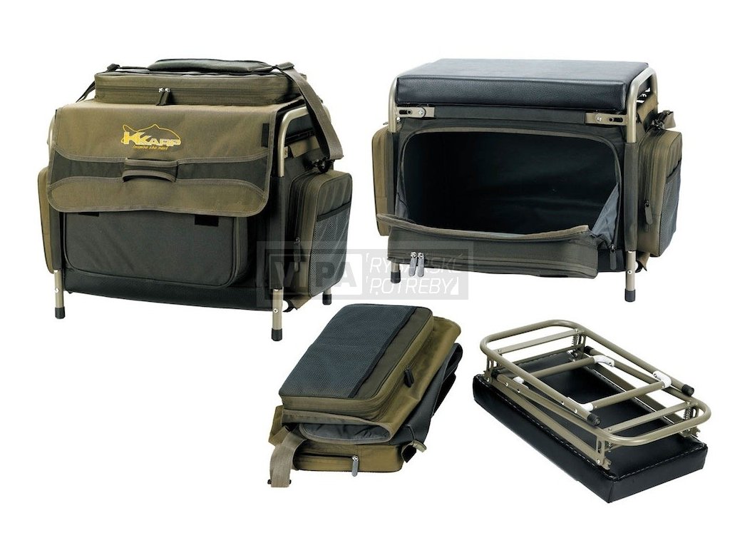 Prostorná kaprová taška s pevnou kovovou konstrukcí a koženým sedákem, který vám slouží jako křesílko. Rozměry jsou 57x62x37cm.