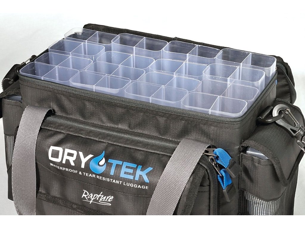 Taška Rapture navržená tak, aby pojala nespočet návnad a drobného příslušenství. Kromě klasických přihrádek na nástrahy jsou po obou stranách plastové boxy s mobilními přihrádkami. Nastavitelný ramenní popruh a pohodlné EVA rukojeti. V horní přihrádce se nachází několik průhledných kapes pro připravené návazce, uzavřené panty, které udržují vnitřek suchý. V hlavní části je mnoho vertikálních přihrádek určených k umístění tvrdých nástrah. V přední kapse pevnější přihrádky pro okamžité použití nástrah.