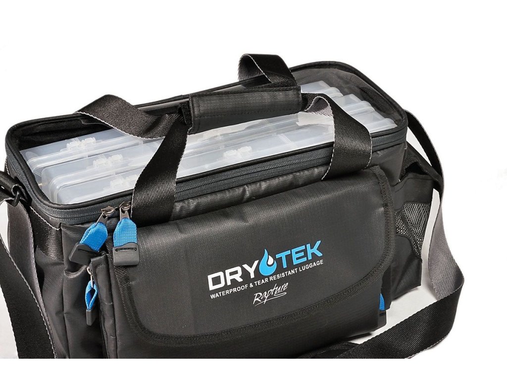 Taška Rapture se třemi velkými boxy na nástrahy a příslušenství, které jsou viditelné přes průhledný kryt. Přední kapsa s přihrádkami na tvrdé nástrahy.